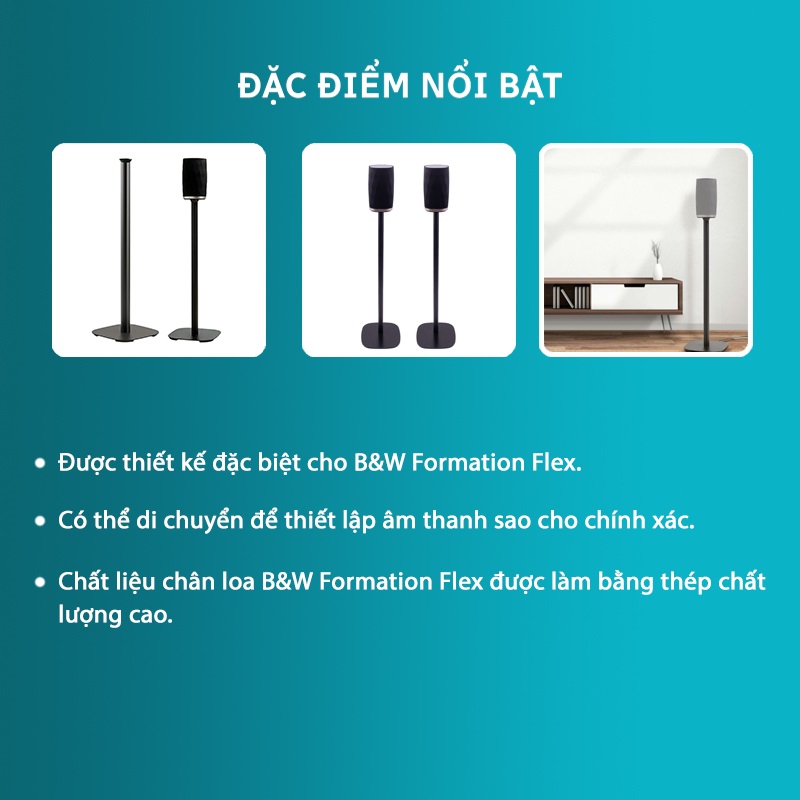 Đây là phụ kiện được thiết kế đặc biệt cho loa B&W Formation Flex, làm bằng thép chất lượng cao, có thể di chuyển để thiết lập âm thanh chính xác. Chân loa này được tùy chỉnh để kết hợp hoàn hảo với loa, mang đến trải nghiệm âm trường không dây tốt nhất thị trường.